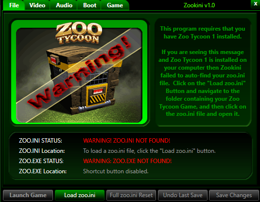 I made this program as easy to use as possible. The first thing it will do is try to automatically find your zoo.ini file. If it is in your zoo tycoon install folder in program files (which it usually is) it should find it just fine. If however you have installed the game in another place, or if when you installed it, it did not have admin permissions, then it may be that you will have to search for the zoo.ini file on your own. If that is the case, just click on Load zoo.ini and navigate to the folder where your zoo.ini is located. (The usual places for this is in your user folder: localappdata). Once it finds the zoo.ini file, Zookini first makes a backup of your zoo.ini file and names it zoo.ini.original. This file is never overwritten by zookini. If you ever feel like you just want to start over with this original zoo.ini file, then you can click the Full zoo.ini Reset Button, and it will copy that zoo.ini.original to zoo.ini for you. Also, if you do ever save changes, then it will make a backup of the last zoo.ini file you had called zoo.ini.undo, which you can restore by hitting the Undo Last Save button. These 2 backups make it incredibly safe to edit your zoo.ini file without any risk. Also, there is error checking on all the input fields, to keep you from entering bad values that aren't allowed by the game, but if it somehow did happen, the game would still launch just fine (it would just replace the bad values with default values). I promise that this is a very safe and easy program to use, so don't be afraid to give it a try. :)