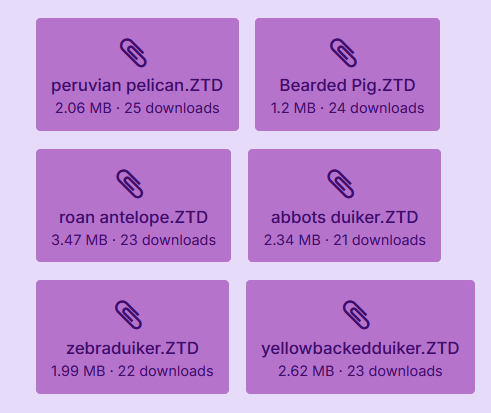 Hawkkeye666 Posted March 17, 2024 Author Posted March 17, 2024 Some old animals I reworked, mostly ungulates. Animals and changes: Bearded Pig (made smaller, now it only has 2 babies), Yellow-Backed Duiker (made slightly smaller, animations more fluent), Zebra Duiker (made slightly bigger, animations more fluent), Abbot´s Duiker (made smaller), Roan Antelope (some animations were deformed, corrected), Peruvian Pelican (remade with different texture and model, I changed the texture of previous model slightly and remade it as Brown Pelican, to be released) Enjoy! *** files removed 2025.12.25 screenshot of files removed: 4